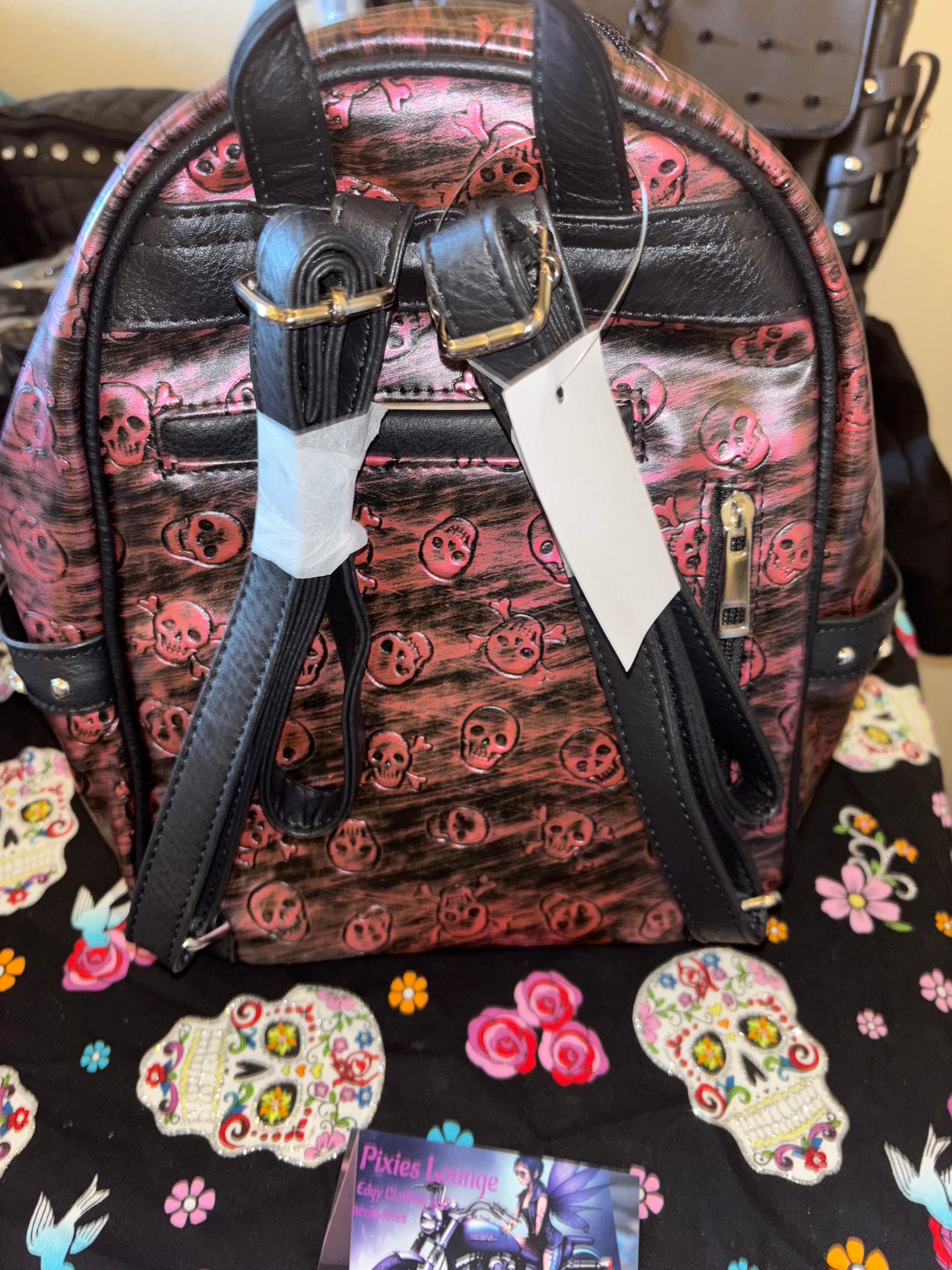 Embrace your edgy side with the Rebel Spirit Backpack, featuring a striking pink, blue, purple, or black design. Adorned with a rhinestone-embellished skull and crossbones, this backpack is perfect for those who dare to be different. The black leather accents and zippered pocket accentuate the gothic feel of the backpack. With four vibrant color options, this backpack is sure to make a statement wherever you go.