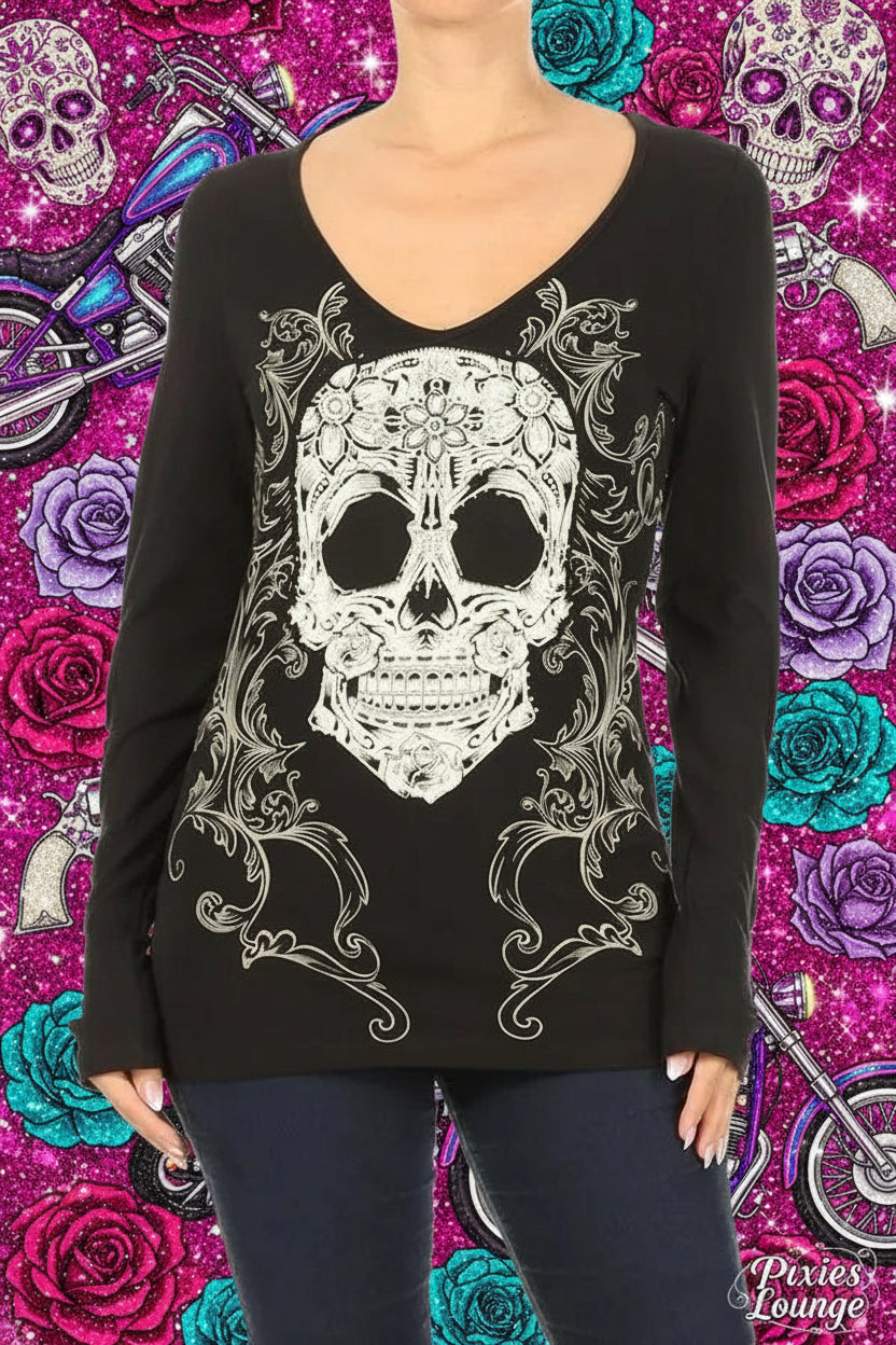 Platinum Plush Candy Skull Cut Out Rhinestone LS Top