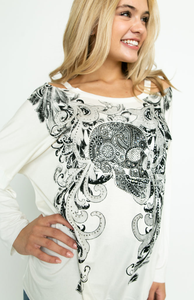 Vocal Distressed Skull Bling Top – Off-Shoulder