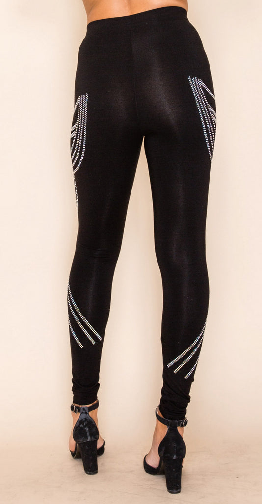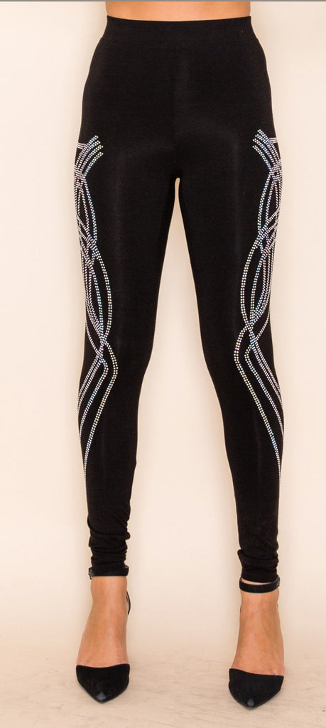 Get ready to SLAY the day in our Sparkle Swirl Slayers High-Waist Leggings! 😎 These bad boys feature a slim, body-contouring fit with a SHOW-STOPPING swirling rhinestone design on one side - from hip to ankle, baby! 💃 Perfect for adding some SPARKLE to your casual vibes or dressy nights out. Made in the USA with super comfy 95% Rayon, 5% Spandex blend. Plus and regular sizes available so EVERYBODY can SLAY 🤘🏼