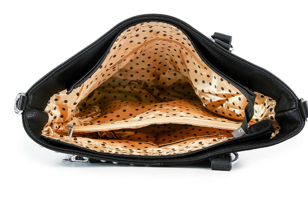 Get ready to turn heads with our Bling Skull Tote! Made of faux leather, this classic tote features an eye-catching design of sparkling skulls and a detachable tassel. The interior is lined and includes slip pockets and a zip pocket for organization. With a top zip closure and tablet compatibility, this tote is both stylish and functional. Approximate size is 15L x 10.5H x 4.5W.