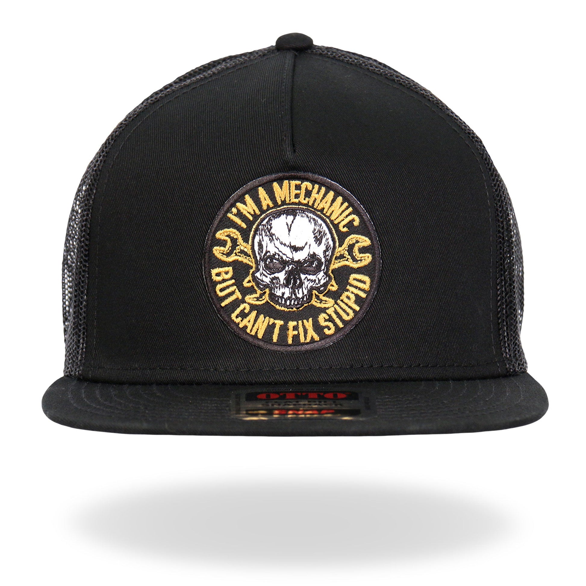 This hat features a black, white and yellow patch reading "I'm A Mechanic But I Can't Fix Stupid".