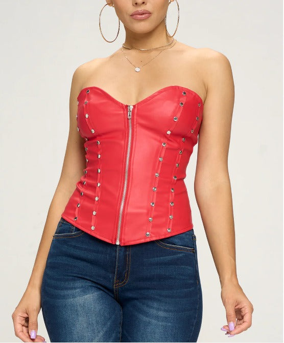 Featuring a front zipper closure, strategic stud detailing, and adjustable lace-up back, this strapless corset delivers a secure fit with a flattering silhouette. The structured boning enhances curves while maintaining comfort, making it perfect for rallies, nights out, or elevating your everyday denim.